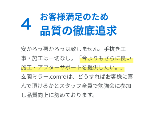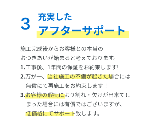 アフターサービス・保証ミラーの施工には細心の注意を払っていますが、 万が一不具合があった場合は、いつでもご相談ください。 すぐに対応させていただきます。当店では1年保証をつけていますので、安心です。